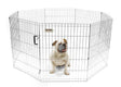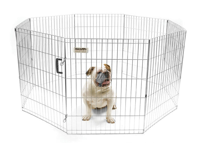 Precision 18in Silver Pro Handler Exercise Pen with Snaps(Choice Play Yard): Tough durable and portable exercise pen features easy set-up design with dual-folding hinges that make it easy to add or remove panels. The dual-folding hinge folds flat in either direction for easy non-invasive storage. The durable construction includes eight 2 ft. wide panels totaling 16 feet in length. The pen has a zinc electroplate finish added after welding to reinforce protection and increase the pen's value. This versatile play yard allows you arrange in your choice of layouts. Offered in a variety of heights. Bolt snap fasteners Included.